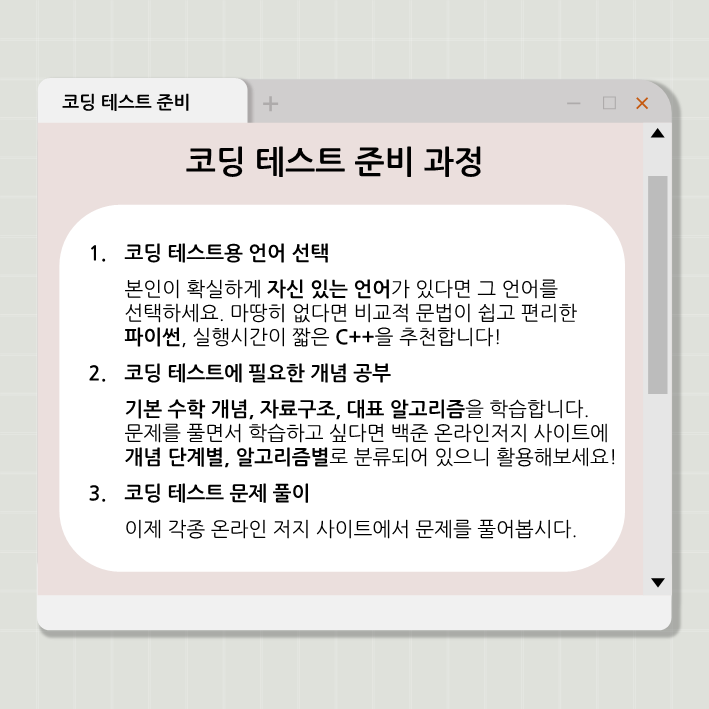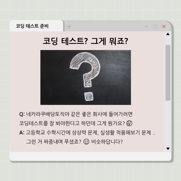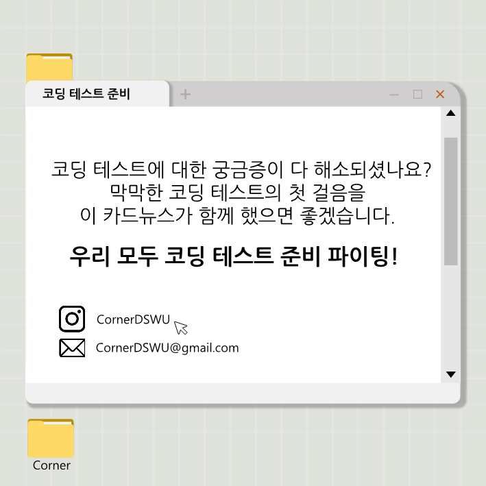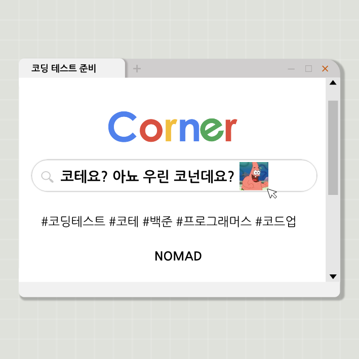 안녕하세요, 컴퓨터공학전공 개발 소모임 𝘾𝙤𝙧𝙣𝙚𝙧입니다. 코너의 15번째 정기 콘텐츠를 공개합니다! 이번 정기 콘텐츠는 Team NOMAD의 코딩테스트에 대한 이야기인데요, 코딩테스트의 준비 과정과 꿀팁에 대해 알아봅시다!
