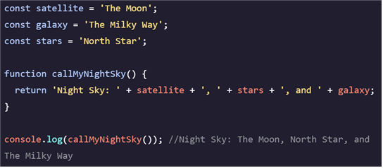 위 코드에서 변수 satelite, galaxy, stars는 전역 스코프에 정의되어 있는 전역 변수이기 때문에 함수 callMyNightSky 블록 내에서도 변수로 사용이 가능하다는 것을 알 수 있습니다.