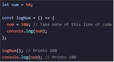 위 코드에서 전역 변수 num은 50으로 선언되었지만, 함수 logNum이 호출되었을 때 함수 내에서 num 값이 100으로 재할당되어 전역 변수에 영향을 주게 됩니다. 따라서 전역 스코프가 무엇인지 아는 것은 중요하지만 전역 스코프에서 변수를 정의하지 않는 것이 가장 좋습니다.