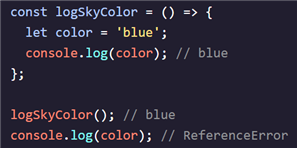 위 코드를 보면, 함수 내에서 변수 color는 함수의 중괄호 내에서만 사용할 수 있으며, 함수 외부에서 변수 color를 사용하려고 했을 경우 오류가 나는 것을 알 수 있습니다.