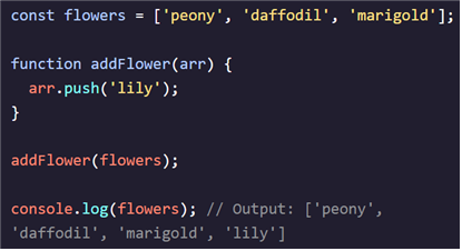 flowers는 3개의 요소가 있는 배열입니다. arr을 매개변수로 하는 함수 addFlower를 정의하고, 배열 끝에 요소 ‘lily’를 추가하도록 설정하였습니다. 배열 flowers를 인수로 하여 함수를 호출하면, 요소 ‘lily’가 추가되어 배열이 변경된 것을 볼 수 있습니다.