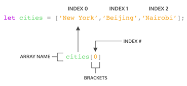 cities는 세 개의 요소가 있는 배열이며, 요소에 접근하기 위해 배열 이름(cities) 뒤에 인덱스가 있는 대괄호 표기법을 사용합니다(배열이름[인덱스번호]). cities[0]은 배열의 인덱스 0에 있는 요소에 접근합니다. 따라서 ‘New York’ 문자열을 보유하고 있는 메모리 공간에 접근하는 것입니다.