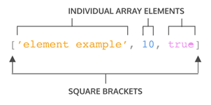 배열 예제의 구문을 자세히 살펴보겠습니다. 배열은 대괄호와 내부 내용으로 표시되며, 배열 내부의 각 항목을 ‘요소’라고 합니다. 위 배열 내부에는 세 가지의 서로 다른 데이터 유형의 요소가 있습니다.