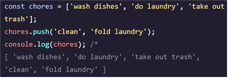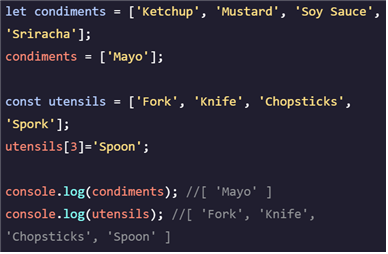 위 예시처럼, let으로 선언된 배열은 4가지 요소가 있는 배열에서 1가지 요소가 있는 새 배열로 할당이 가능하며, 요소의 변경도 가능합니다. const로 선언된 배열은 요소의 변경만 가능하며 재할당은 불가능합니다.