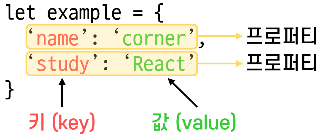 괄호({ })를 사용하여 객체 리터럴을 지정한다. 키의 이름를 작성 하고 콜론과 값을 차례로 작성하여 키-값 쌍을 만든다. 객체 리터럴에서 키-값 쌍은 쉼표(,)로 구분한다. 프로퍼티는 객체의 속성을 나타내는 접근 가능한 이름과 활용 가능한 값을 가지는 특별한 형태이다. 특정 객체가 가지고 있는 정보를 품고 있어 그 객체가 가진 정보에 직접적으로 접근할 수 있게 한다.