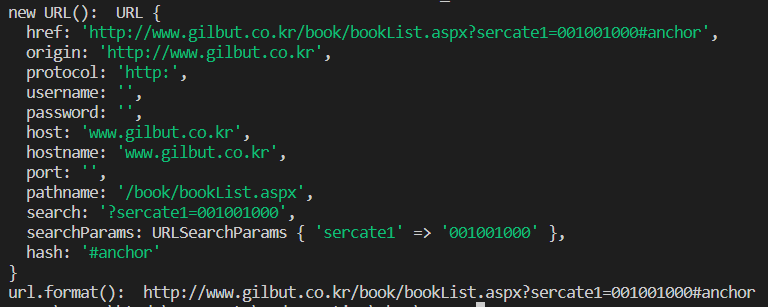 const myURL = new URL('http://www.gilbut.co.kr/book/bookList.aspx?sercate1=001001000#anchor')