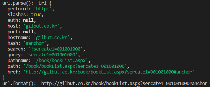 const parsedUrl = url.parse('http://gilbut.co.kr/book/bookList.aspx?sercate1=001001000#anchor')