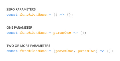 function 키워드 대신 화살표(=>)를 사용하여 간략한 방법으로 함수를 선언할 수 있다. 소괄호 ( ) 안에 매개변수를 적고, 화살표 기호=>가 함수의 내용을 서술한 중괄호 { }를 가리키도록 한다.