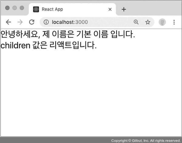 위처럼 MyComponent를 수정하여, props 값을 지정하지 않는다면 '안녕하세요, 제 이름은 기본 이름입니다.'가 출력되는 것을 알 수 있습니다.