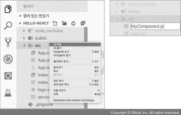 컴포넌트를 만들기 위해 컴포넌트 코드를 선언해야 합니다. VS Code 왼쪽의 사이드 바에서 파일 목록 중 src 디렉터리를 우클릭하여 새 파일 메뉴를 선택합니다. 새 파일 이름을 MyComponent.js로 입력해 주세요.