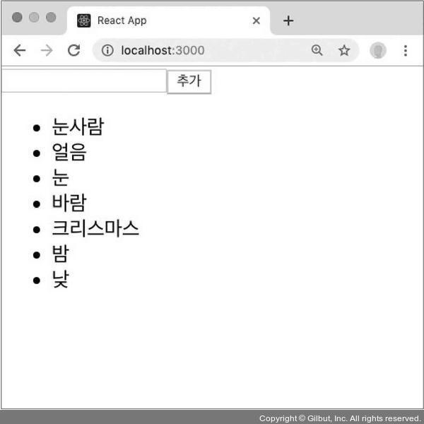 입력 후, 버튼을 누르면 onClick 함수가 호출됩니다. onClick 함수에서는 names 배열의 사본을 만들어 concat으로 새 데이터를 추가합니다. 그 후 세터 함수를 이용해 nextId와 배열 names를 업데이트합니다..