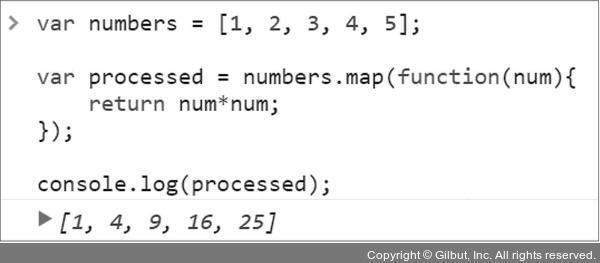 위와 같이 콘솔창을 열어 map() 함수를 작성해보세요. 배열 numbers의 각 요소의 제곱 값을 새로운 배열에 저장했습니다. 이처럼 map() 함수는 배열의 각 요소에 쉽게 접근할 수 있습니다.