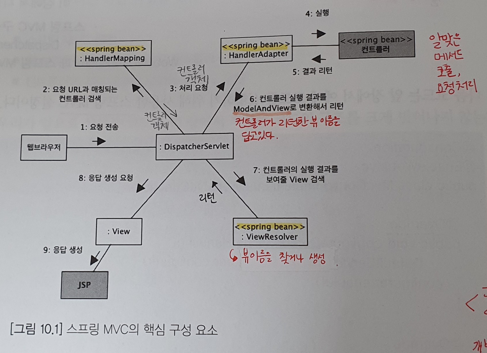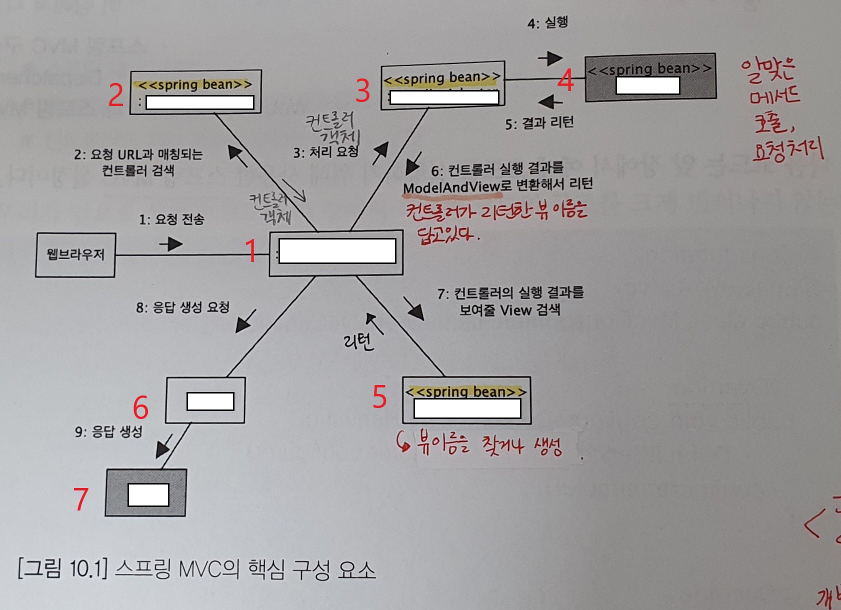 답: 1. DispatcherServlet, 2. HandlerMapping, 3. HandlerAdapter, 4. 컨트롤러, 5.ViewResolver, 6. View, 7. JSP