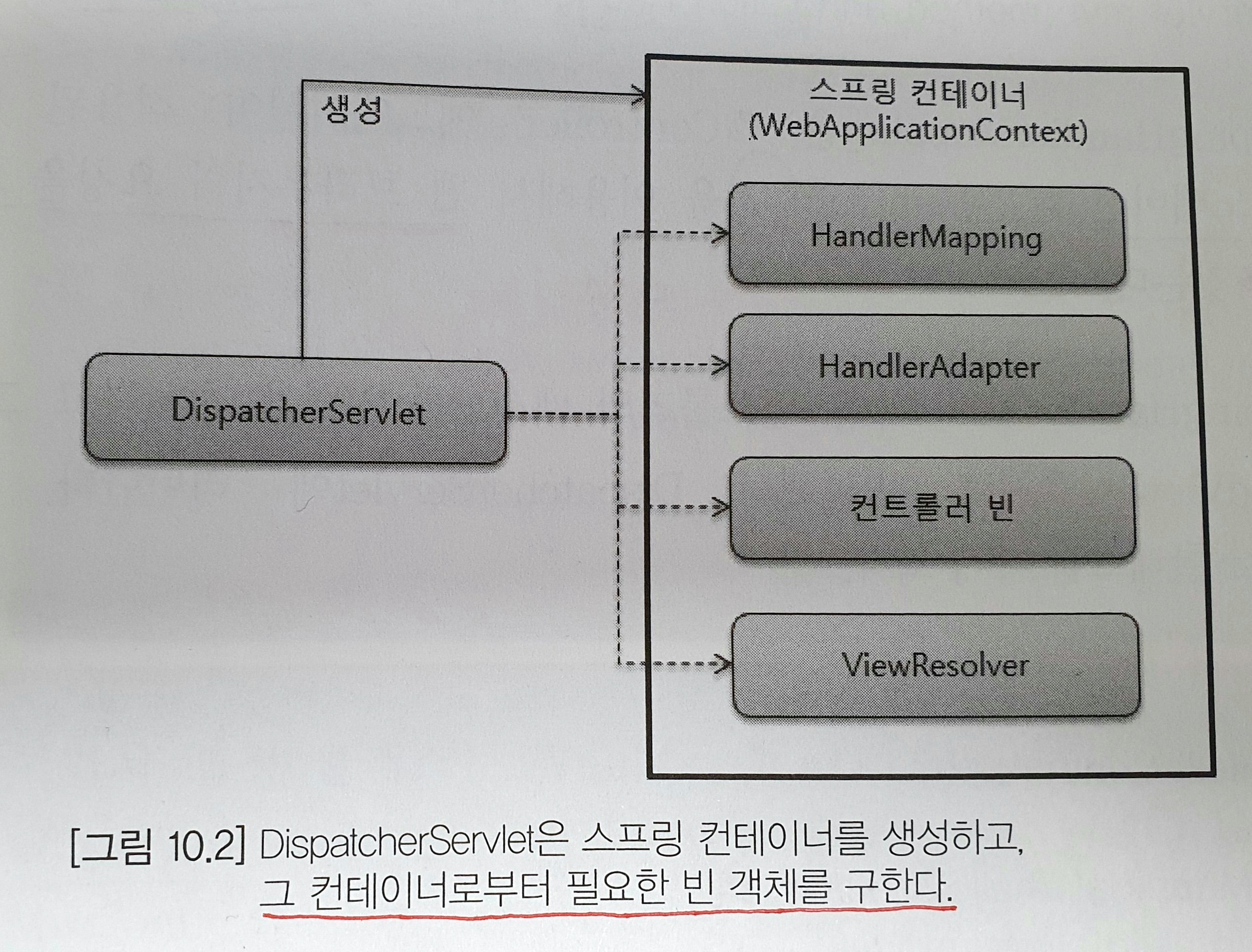 HandlerMapping, HandlerAdapter, 컨트롤러, ViewResovler 등의 빈은 이 (스프링 컨테이너)에서 구하기 때문에,