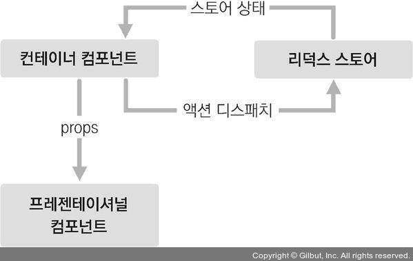 리액트 프로젝트에서 리덕스를 사용할 때 가장 많이 사용하는 패턴은 프레젠테이셔널 컴포넌트와 컨테이너 컴포넌트를 분리하는 것입니다. 여기서 프레젠테이셔널 컴포넌트란 주로 상태 관리가 이루어지지 않고, 그저 props를 받아와 화면에 UI를 보여주기만 하는 컴포넌트를 말합니다. 이와 달리 컨테이너 컴포넌트는 리덕스와 연동되어 있는 컴포넌트로, 리덕스로부터 상태를 받아오기도 하고 리덕스 스토어에 액션을 디스패치하기도 합니다.