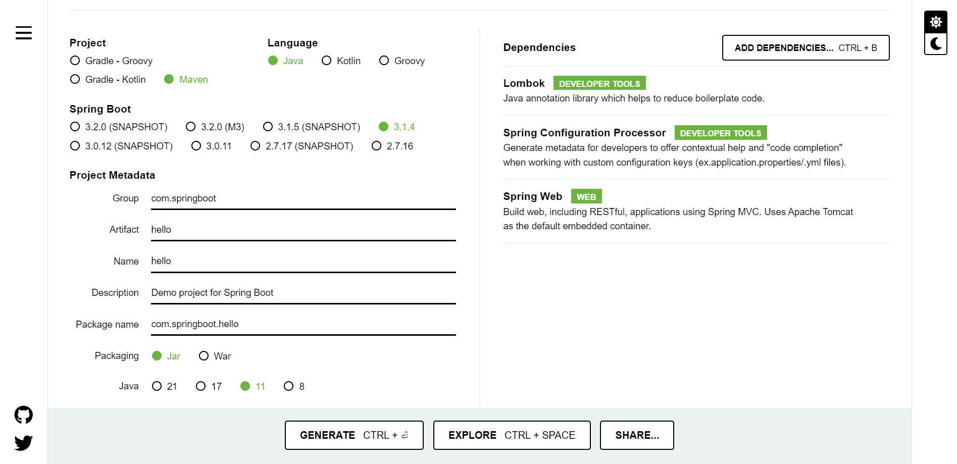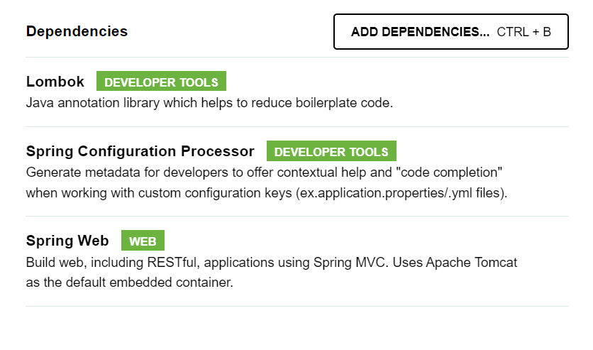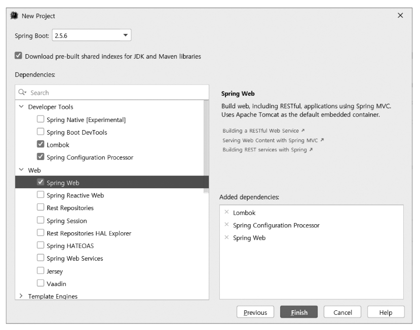 2. 스프링 공식 사이트에서 프로젝트를 생성할 시, 추가해야하는 의존성은 ( Lombok, Spring Configuration Processor, Spring Web ) 이다.