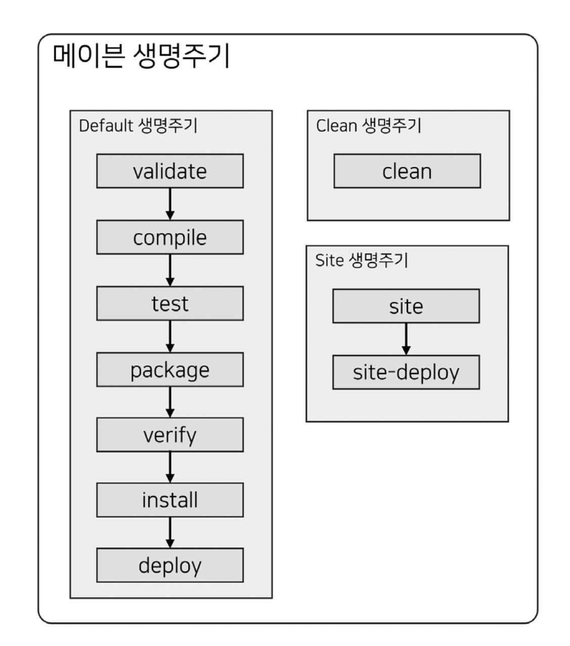 • deploy : 프로젝트를 통합 또는 릴리스 환경에서 다른 곳에 공유하기 위해 원격 저장소에 패키지를 복사