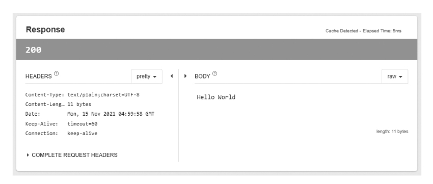 앞서 3.3의 웹 브라우저에서 확인했을 때와 마찬가지로 'Hello World'가 정상적으로 출력됨
