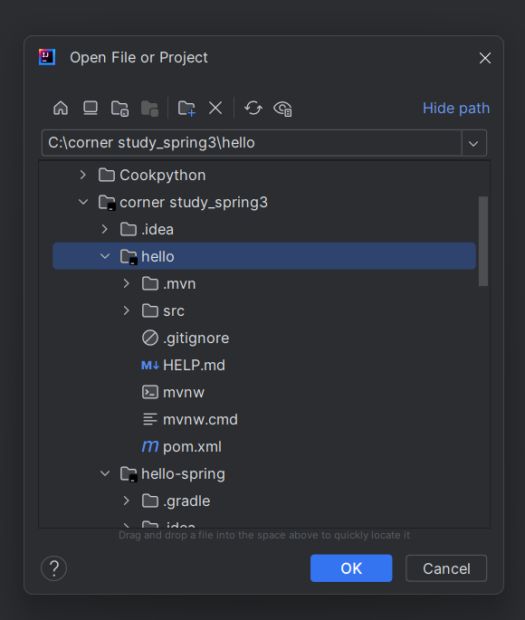 4. 내려받은 압축 파일을 프로젝트를 진행할 경로로 옮기고 압축을 푼 후 인텔리제이 IDEA를 실행하고 프로젝트 열기