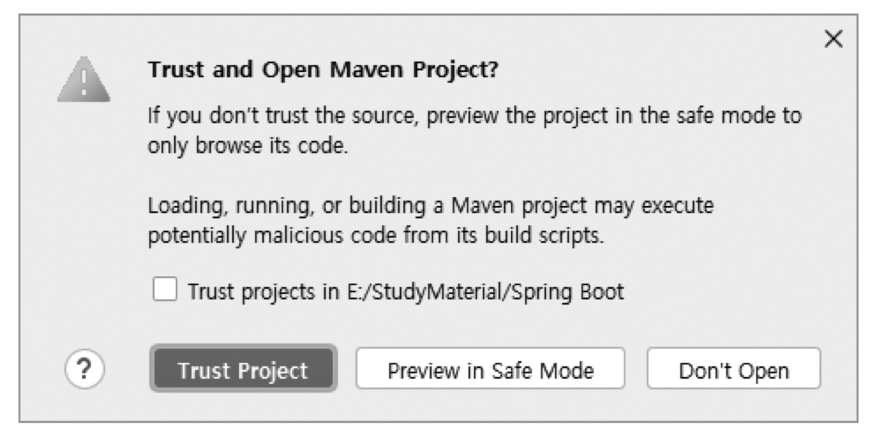 +) 외부에서 내려받은 프로젝트를 인텔리제이 IDEA에서 열면 경고 문구가 나타나는 경우가 존재