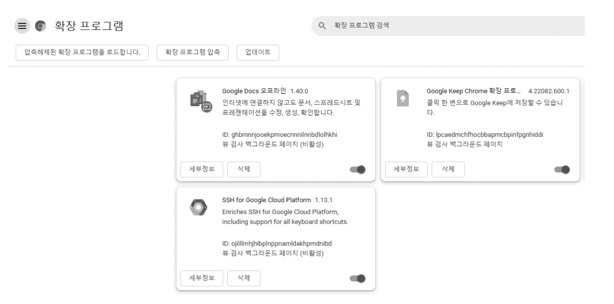 1. 크롬 브라우저의 주소창에 'chrome://extensions/'를 입력하거나 우측 상단의 메뉴 버튼( ⋮ )을 클릭한 후 [도구] → [더보기] → [확장 프로그램]을 선택하면 아래의 사진과 같은 크롬 브라우저에서 사용 중인 확장 프로그램을 볼 수 있음