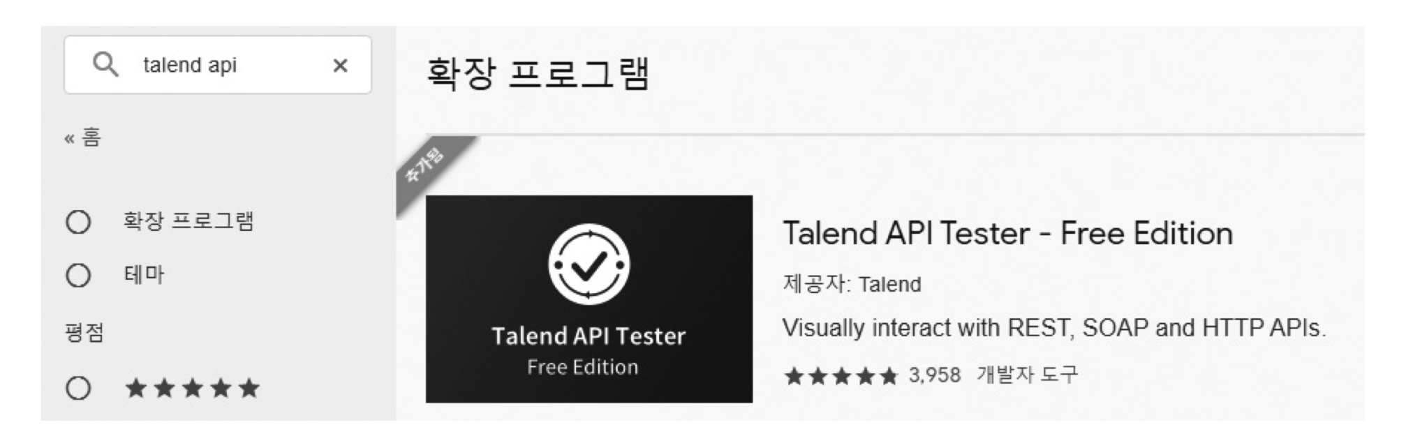 그 후 크롬 웹 스토어에서 'Talend API'를 검색하고 'Talend API Tester - Free Edition'을 찾아 [Chrom에 추가] 버튼을