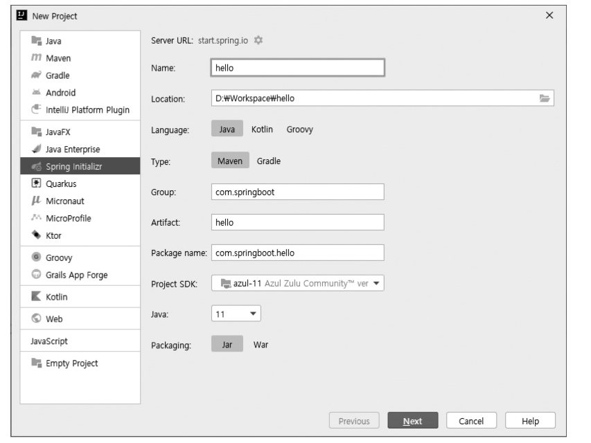 - Package Name(자동완성) : com.springboot.hello