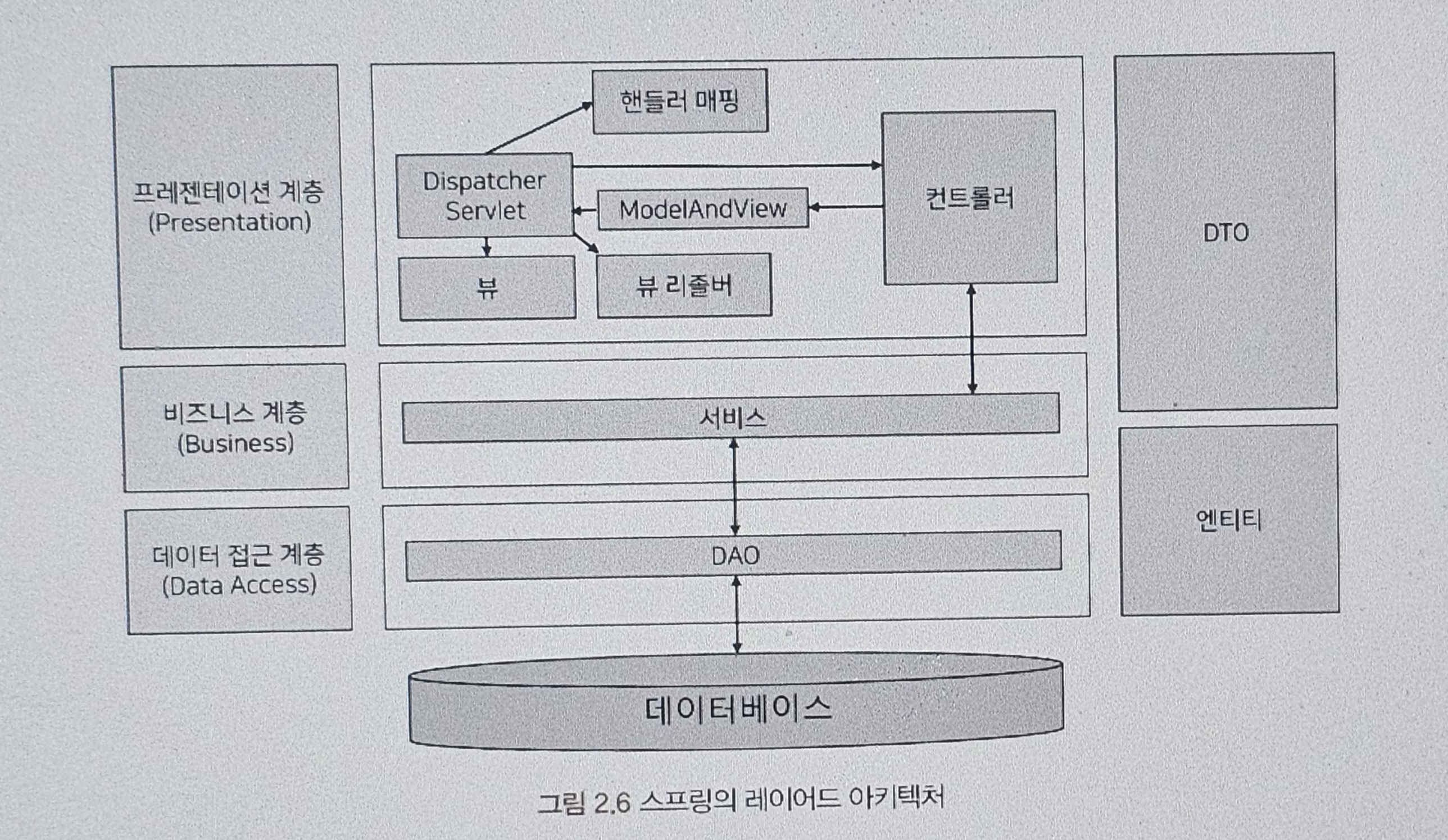 스프링에서의 레이어드 아키텍처는 다음과 같습니다.