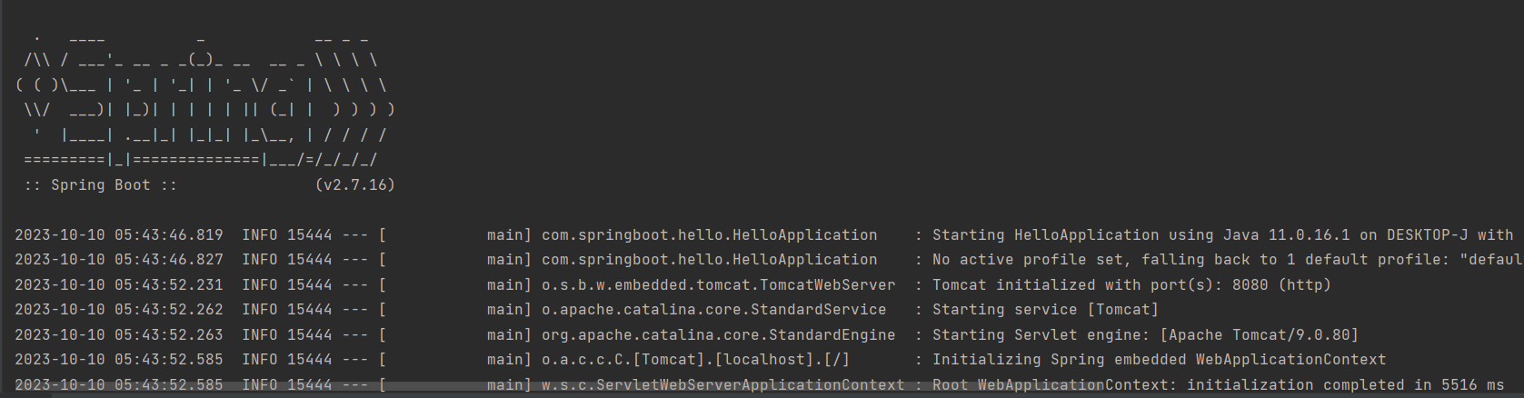 HelloApplication을 Run 버튼을 통해 실행하면 아래와 같이 실행 로그가 출력됩니다.