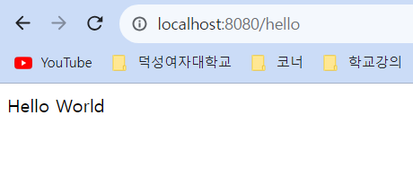스프링 부트가 설정한 URL 주소로 이동하면 실행 결과를 확인할 수 있습니다. http://localhost:8080/hello 에 접속하면 hello world의 실행 결과를 확인할 수 있습니다.