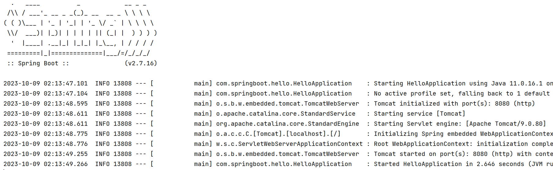 실행 로그의 세 번째 줄에서 8080번 포트를 통해 웹 서버가 열린 것을 확인할 수 있습니다.