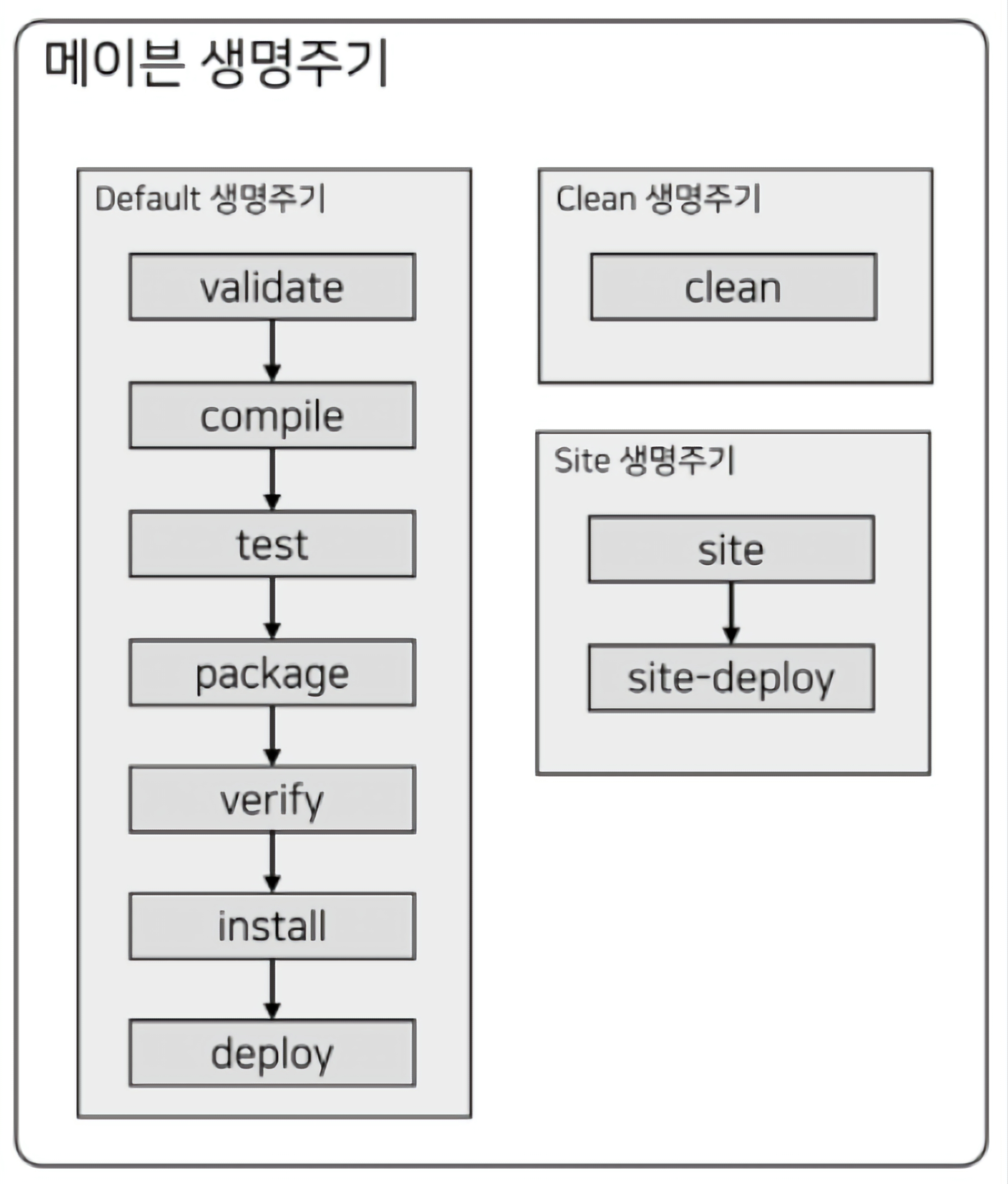 | 기본 생명주기 - validate: 프로젝트를 빌드하는 데 필요한 모든 정보를 사용할 수 있는지 검토합니다. - compile: 프로젝트의 소스코드를 컴파일합니다. - test: 단위 테스트 프레임워크를 사용해 테스트를 실행합니다. - package: 컴파일한 코드를 가져와서 JAR 등의 형식으로 패키징을 수행합니다. - verify: 패키지가 유효하며 일정 기준을 충족하는지 확인합니다. - install: 프로젝트를 사용하는 데 필요한 패키지를 로컬 저장소에 설치합니다. - deploy: 프로젝트를 통합 또는 릴리스 환경에서 다른 곳에 공유하기 위해 원격 저장소에 패키지를 복사합니다. |