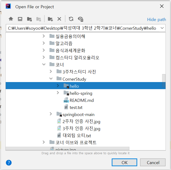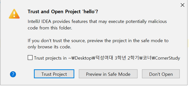 내려받은 압축 파일을 프로젝트를 진행할 경로로 옮기고 압축을 푼 후 인텔리제이 IDEA를 실행하고 아래의 사진과 같이 프로젝트를 선택해 열어봅니다. 외부에서 내려받은 프로젝트를 인텔리제이 IDEA에서 열면 경고 문구가 나타나는 경우가 있습니다. [Trust Project] 버튼을 클릭해 줍니다.