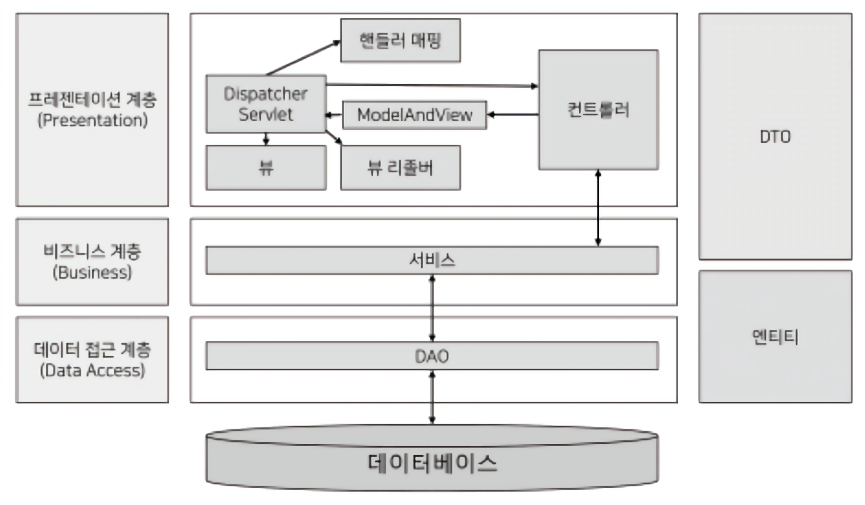 Spring MVC는 Model-View-Controller의 구조로 View와 Controller는 프레젠테이션 계층 영역이며, Model은 비즈니스와 데이터 접근 계층의 영역으로 구분될 수 있습니다. 비즈니스 계층에는 서비스를 배치해 엔티티와 같은 도메인 객체의 비즈니스 로직을 조합하도록 하고 데이터 접근 계층에는 DAO(Spring Data JPA에서는 Repository)를 배치해 도메인을 관리합니다.