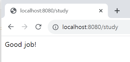 9. 아래의 사진처럼 웹 브라우저의 주소창에 'http://localhost:8080/study'를 입력하면 Good job!이 출력되도록 하는 컨트롤러 코드를 작성하세요.