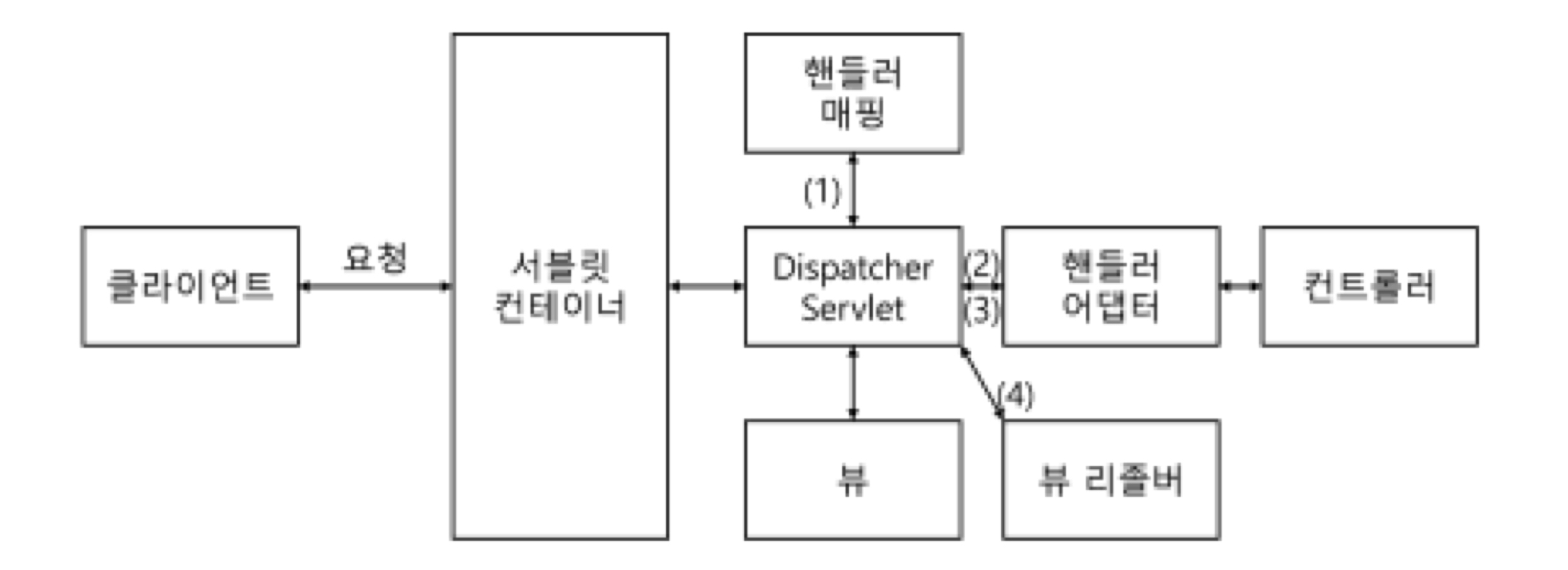 | (1) DispatcherServlet으로 요청(HttpServletRequest)이 들어오면 DispatcherServlet은 핸들러 매핑을 통해 요청 URI에 매핑된 핸들러(Controller)를 탐색합니다. (2) 핸들러 어댑터(HandlerAdapter)로 컨트롤러를 호출합니다. (3) 핸들러 어댑터에 컨트롤러의 응답이 돌아오면 ModelAndView로 응답을 가공해 반환합니다. (4) 뷰 형식으로 리턴하는 컨트롤러를 사용할 때는 뷰 리졸버(ViewResolver)를 통해 뷰를 받아 리턴합니다. |