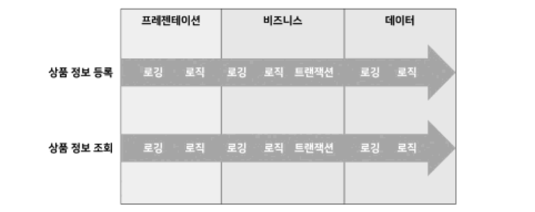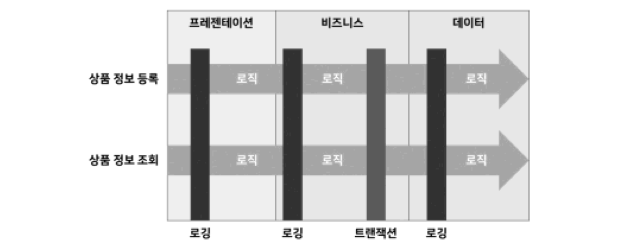 그런데 실제 애플리케이션을 개발할 때는 핵심 기능에 부가 기능을 추가할 상황이 생깁니다. 핵심 기능인 비즈니스 로직 사이에 로깅 처리를 하거나 트랜잭션을 처리하는 코드를 예로 들 수 있습니다.