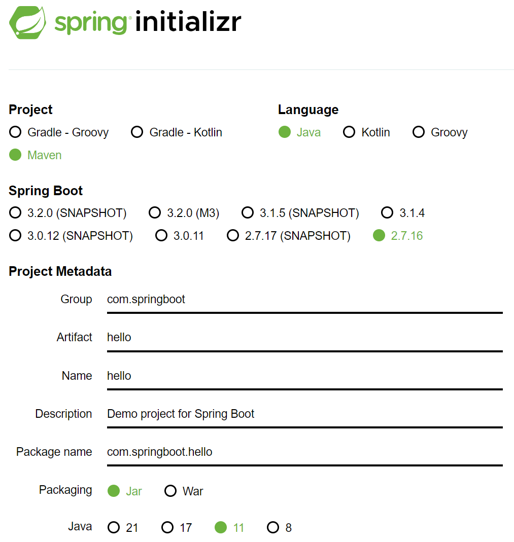 https://start.spring.io 경로로 접속하면 아래와 같은 화면이 나옵니다. 각 항목을 다음과 같이 설정하고 하단의 [GENERATE] 버튼을 누르면 설정이 적용된 프로젝트 파일을 내려받을 수 있습니다.