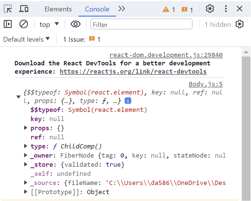 이 객체는 리액트 컴포넌트를 표현한 것이므로 오류가 발생하지 않는다.