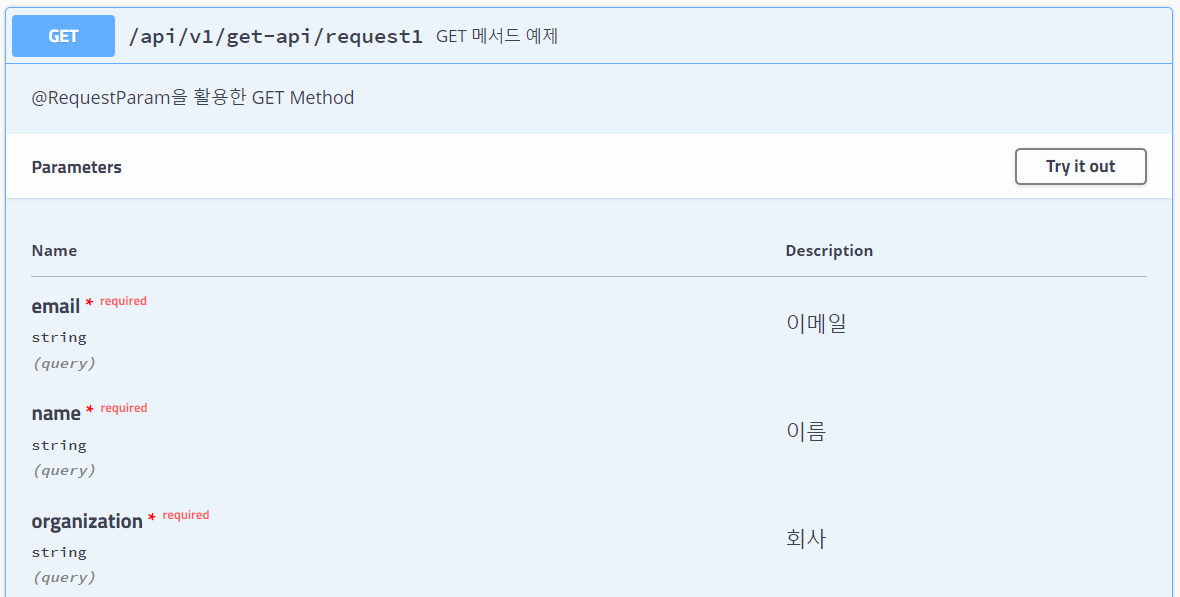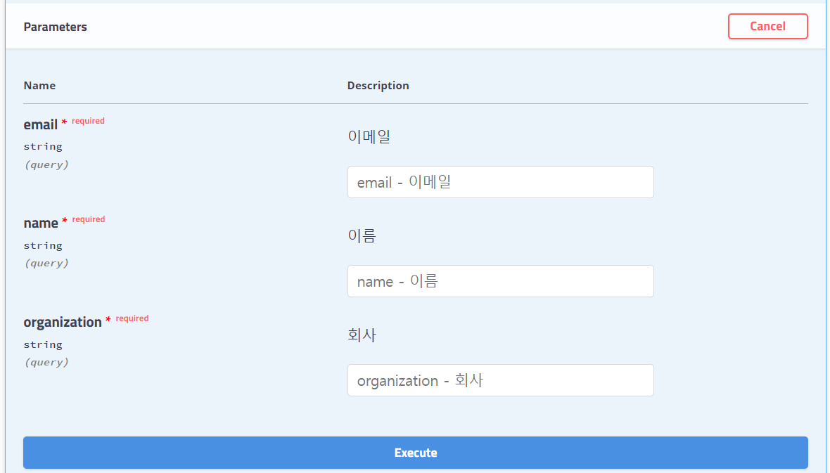 Swagger에서는 직접 통신도 가능하다. [Try it out] 버튼을 클릭해서 각 항목의 값을 기입하고