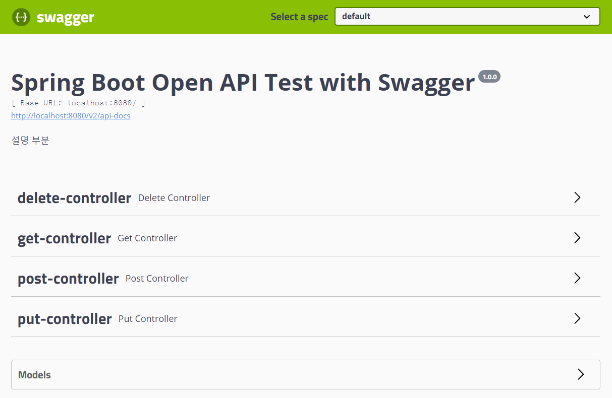 스프링 애플리케이션 실행 후 웹 브라우저를 통해 http://localhost:8080/swagger-ui.html로 접속하면 다음과 같이 Swagger 페이지가 출력된다.