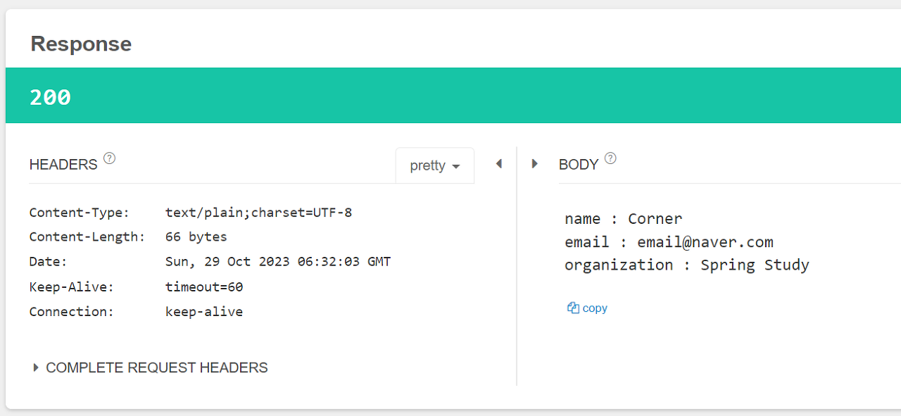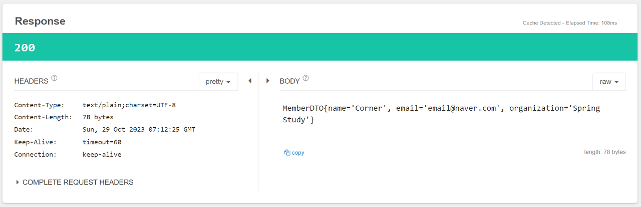 @getRequestParam3() 메서드 호출 결과 => MemberDTO{name='value1', email='value2', organization='value3'}