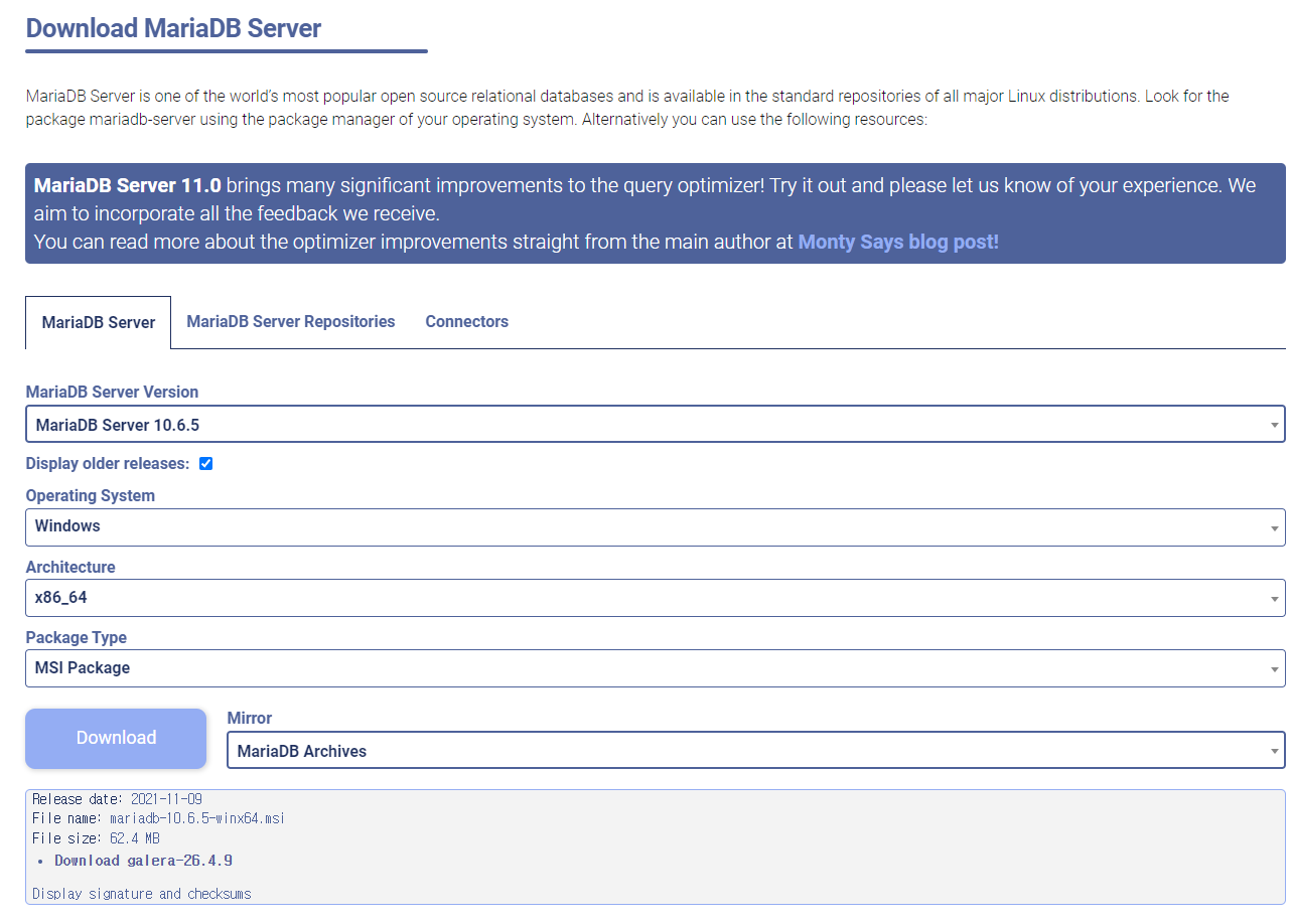 - 마리아 DB 다운로드 페이지(https://mariadb.org/download) 에서 다운 가능