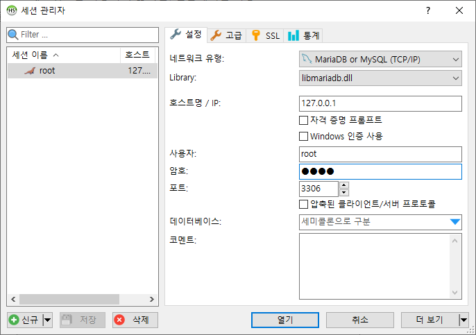 - 사용자는 root로, 암호는 마리아 DB 설치 시 지정한 패스워드를 입력