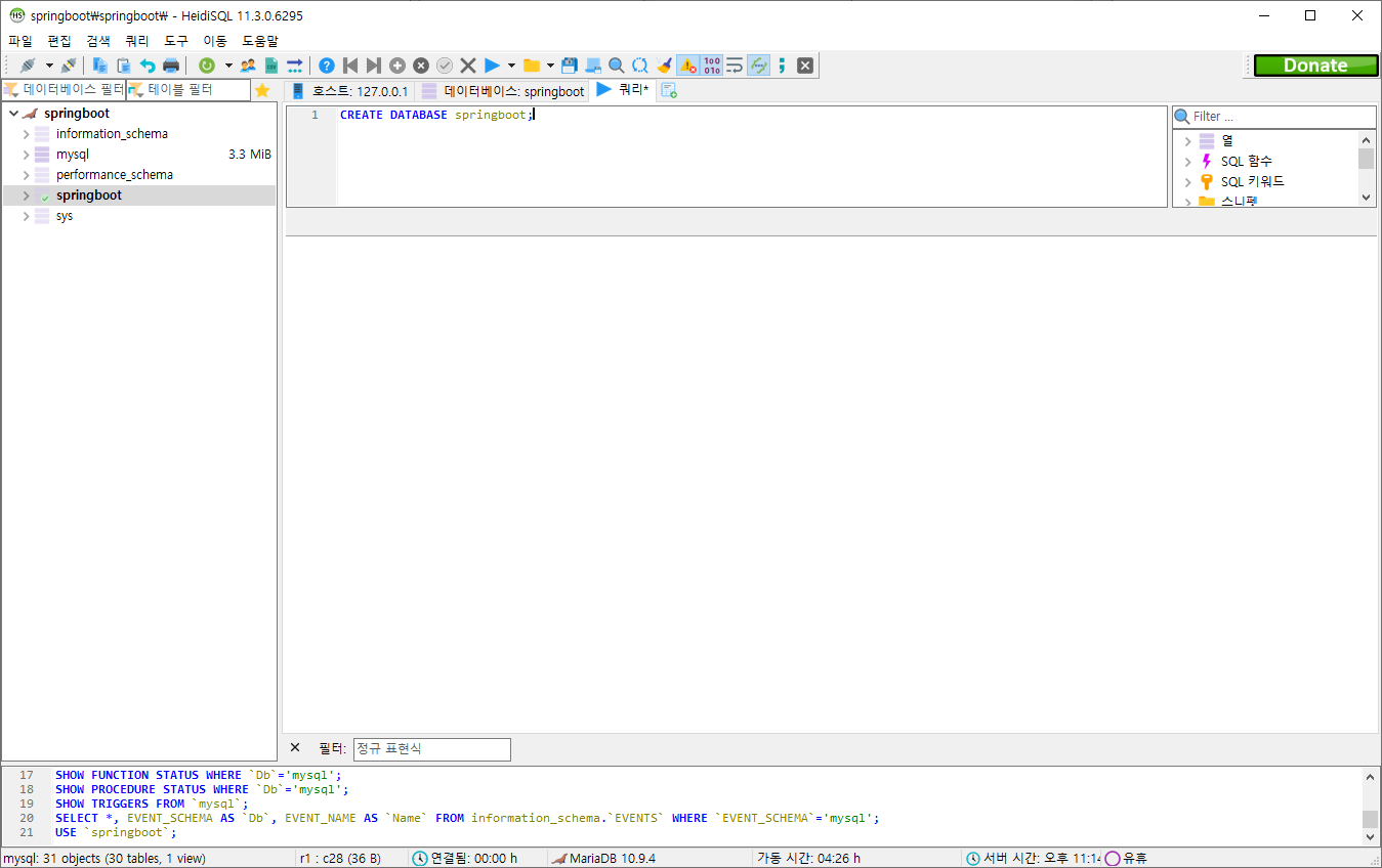 - 데이터 베이스 접속 시 기본으로 설정되는 데이터 베이스는 환경 설정 등의 정보를 담으므로 수정하지 않음