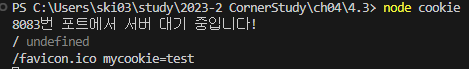 ๐ / undefinded, /favicon.ico mycookie=test ๋ ๊ฐ๊ฐ ๊ธฐ๋ก๋ ์ด์