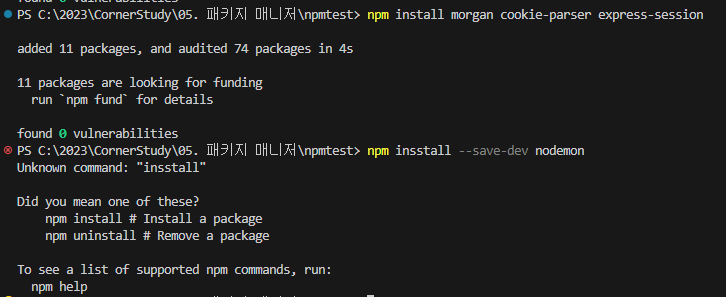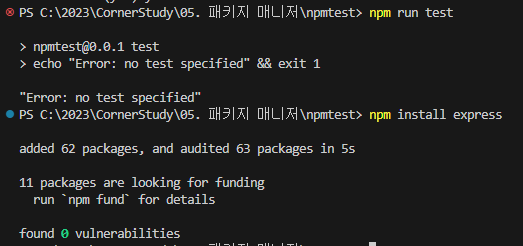 - npm install [ํจํค์ง1] [ํจํค์ง2] [ํจํค์ง3] ... : ํจํค์ง ๋ค์ด๋ก๋ (๋ค์ดํ ํจํค์ง๊ฐ package.json์ ๊ธฐ๋ก๋จ)