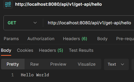 }Talend API Tester, Postman 등의 API 플랫폼을 사용하여 작성한 메서드를 호출할 수 있습니다. Postman을 사용하여 호출해 보도록 하겠습니다. GET 방식을 선택 후 주소를 입력하여 Send 버튼을 클릭합니다. 그러면 getHello 메서드에서 반환된 'Hello World'가 출력되는 Response를 확인할 수 있습니다.