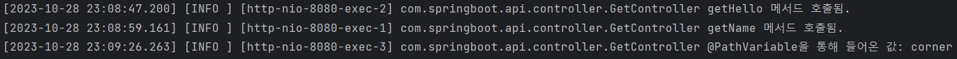 private final Logger LOGGER = LoggerFactory.getLogger(GetController.class);Logger는 LoggerFactory를 통하여 객체를 생성합니다. 이 과정에서 클래스의 이름을 함께 지정하여 클래스의 정보를 Logger에서 가져갑니다. 이제 이전 예제에서 작성했던 메서드에 로그를 출력하는 코드를 삽입합니다.