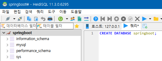 세션이 잘 저장되었다면, [열기] 버튼을 클릭하여 데이터베이스에 접속합시다. 기본적으로 데이터베이스 4개가 존재하는데, 마리아DB의 환경 설정 정보를 담고 있는 것이기 때문에 실습 과정에서 다루지는 않을 것입니다. 쿼리 탭을 선택하여 데이터베이스 생성 쿼리를 입력하고 실행(▶)합니다. 정상적으로 실행되었다면 좌측 탭에서 springboot 데이터베이스가 생성된 것을 확인할 수 있습니다.